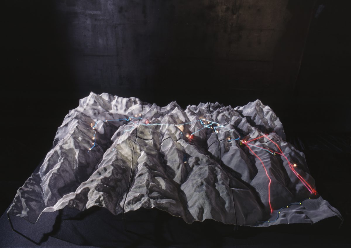 Cette maquette, complétée par de courtes séquences audiovisuelles, présente l’ensemble de l’aménagement aux visiteurs du pavillon d’exposition. L’utilisation, pour la réalisation du relief, d’un treiilis plastique thermoformé permet, en fonction de l’éclairage, de privilégier la vision en surface ou la vison en sous-sol des installations.